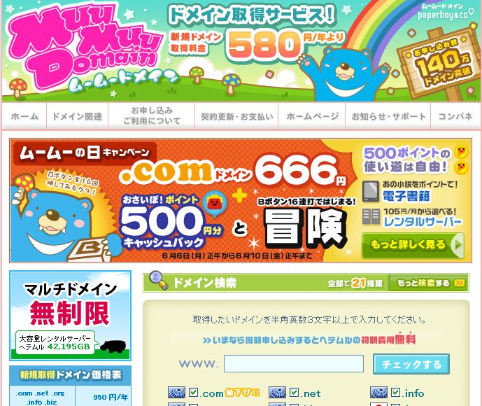 『ムームードメイン』は、6月6日【ムームーの日】にちなんで 毎年恒例となるキャンペーンを、6月6日(月)よりスタート! キャンペーン期間中は『.com 』ドメイン新規取得が666円! さらに先着2,000名に・・・ 『ムームードメイン』でのドメイン取得や『ロリポップ!レンタルサーバー』 などで使えるおさいぽ!ポイントが500円分もらえるみたいです ※ロリポプラン 詳細はこちら
